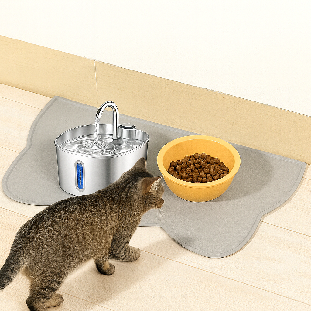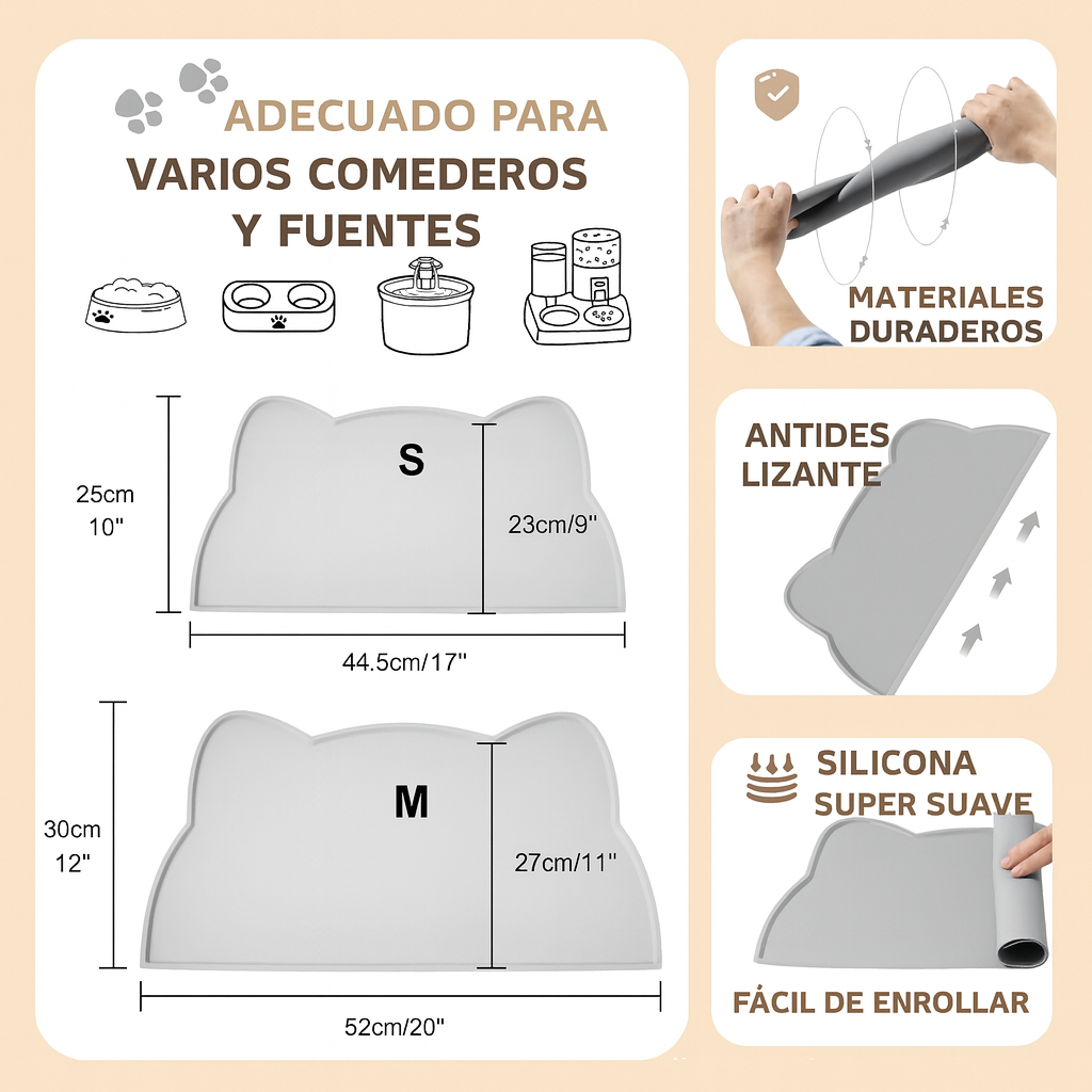 Mantén el área de alimentación de tu gato siempre limpia y ordenada con nuestra alfombrilla de silicona en forma de gatito, el complemento perfecto para tu fuente de agua y comederos. Fabricada con silicona de alta calidad, antideslizante y súper flexible, evita que los recipientes se desplacen y protege el suelo de salpicaduras de agua o restos de comida.