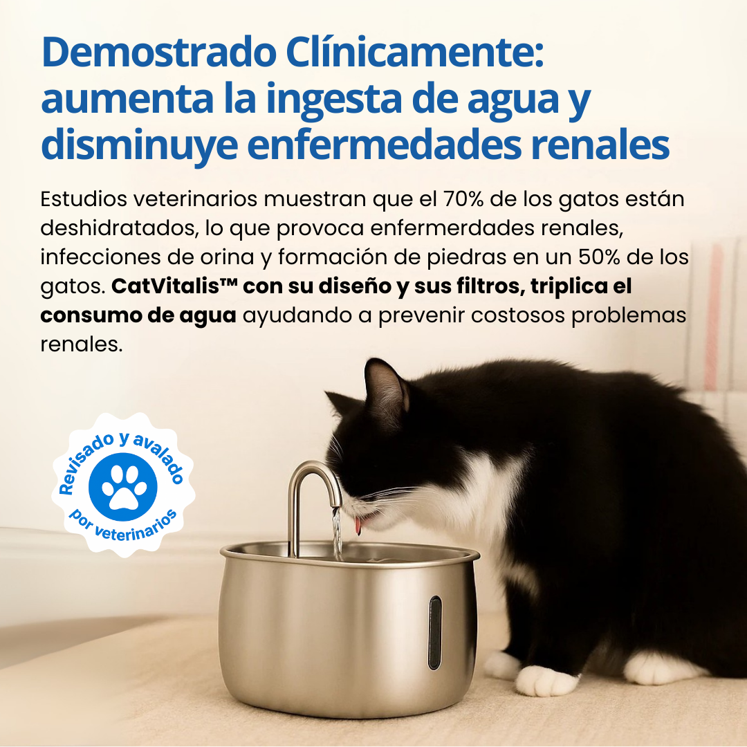 No esperes a una emergencia que ponga en riesgo su vida. El sistema de triple filtrado de CatVitalis™ ayuda a prevenir la deshidratación, las enfermedades renales y las obstrucciones urinarias antes de que aparezcan.