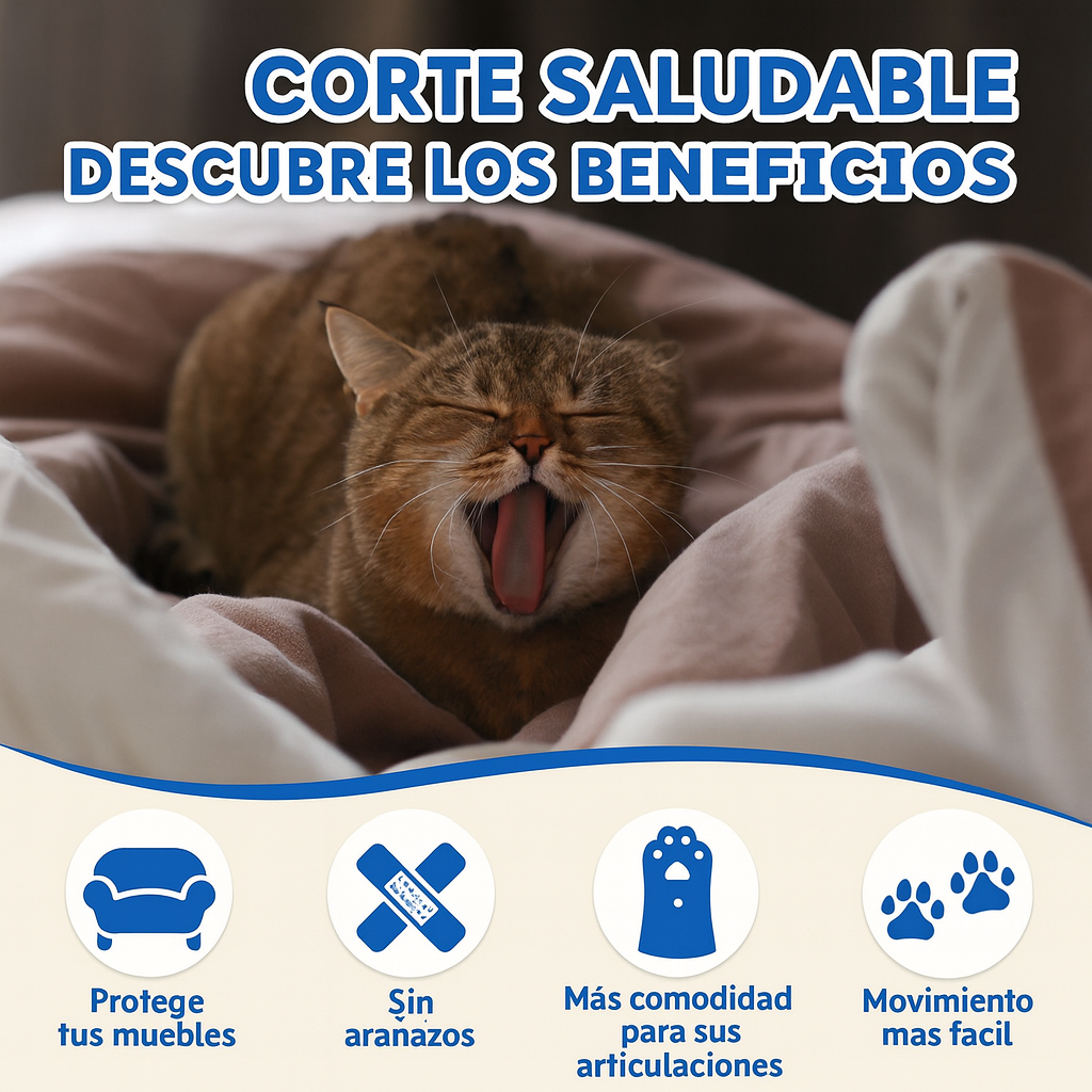 Uñas cortas y sanas → menos arañazos en casa, menos estrés en el veterinario y más bienestar para tu gato.